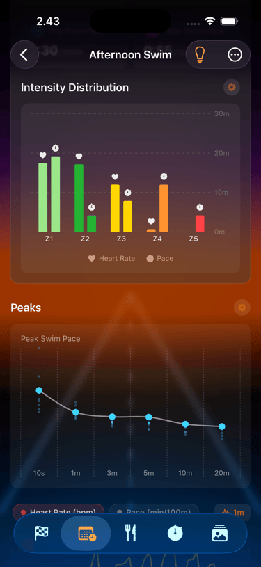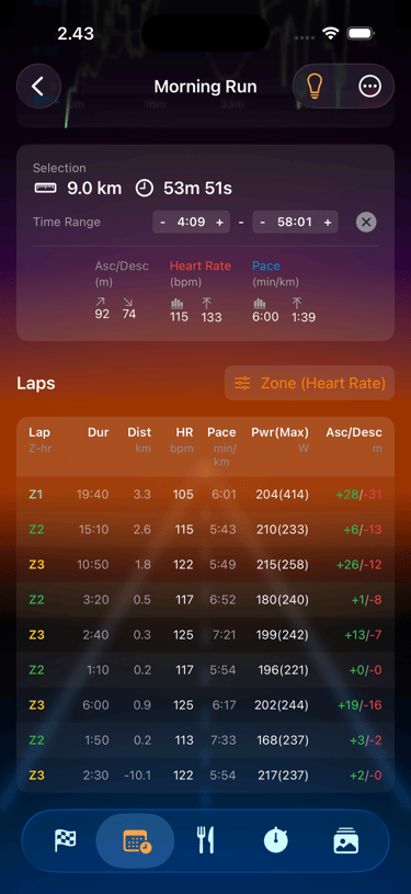Analyze heart rate, pace, and power zones to understand how your effort was distributed across intensity levels.