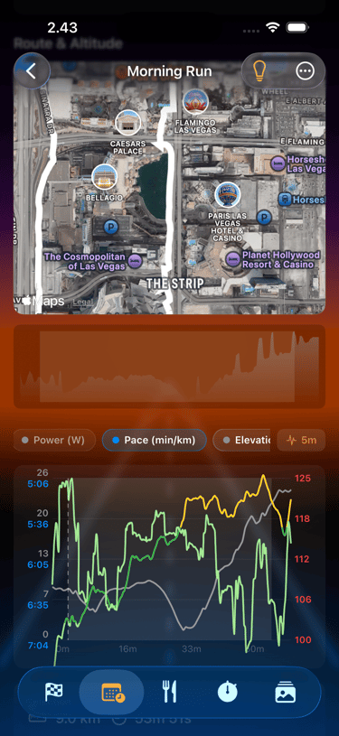 Dive into dynamic charts for pace, power, heart rate, and elevation. Adjustable smoothing lets you control the level of detail—from broad trends to second-by-second precision.