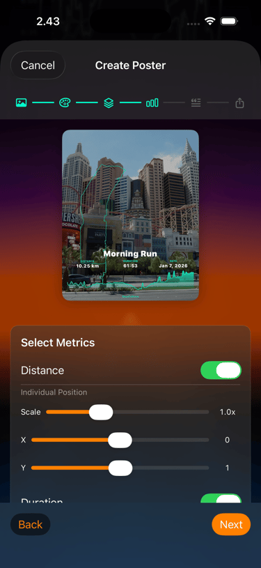 Create a polished social post with your photos, route map, graphs, and key statistics. Customize the layout and share your effort with confidence.