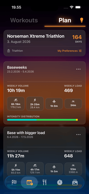 Monitor weekly totals including duration, training load, intensity distribution, and sport split while planning.