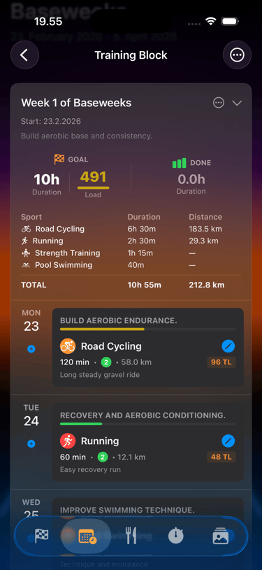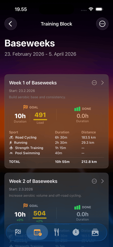 Insert ready-made training weeks into blocks—or plan each day manually for complete control.