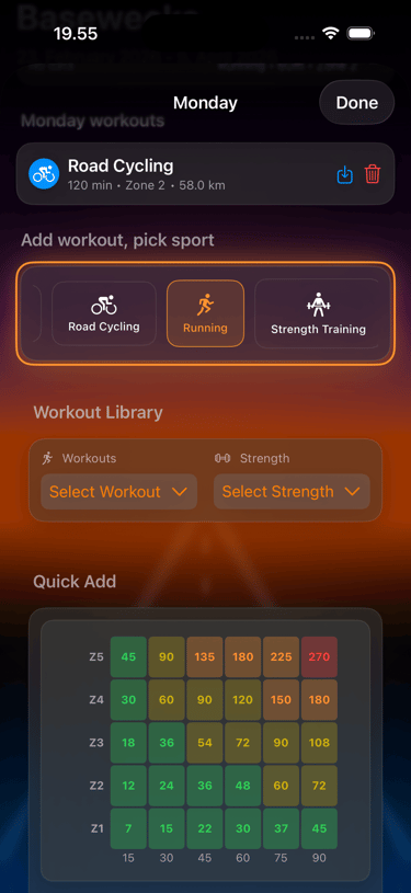 Reuse previously created workouts or quickly add new sessions using an intensity-duration grid to calculate training load instantly.